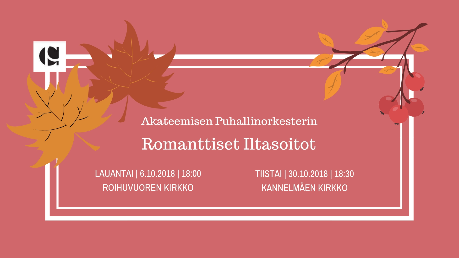 Akateemisen Puhallinorkesterin Romanttisten Iltasoittojen sarja saa jatkoa tiistaina 30.10 klo 18:30 Kannelmäen kirkossa. Orkesteri tarjoilee syksyn pimeneviin iltoihin kattauksen teoksia romantiikan aikakaudelta ja tunnelmallista kamarimusiikkia orkesterin pienyhtyeiden soittamana.
